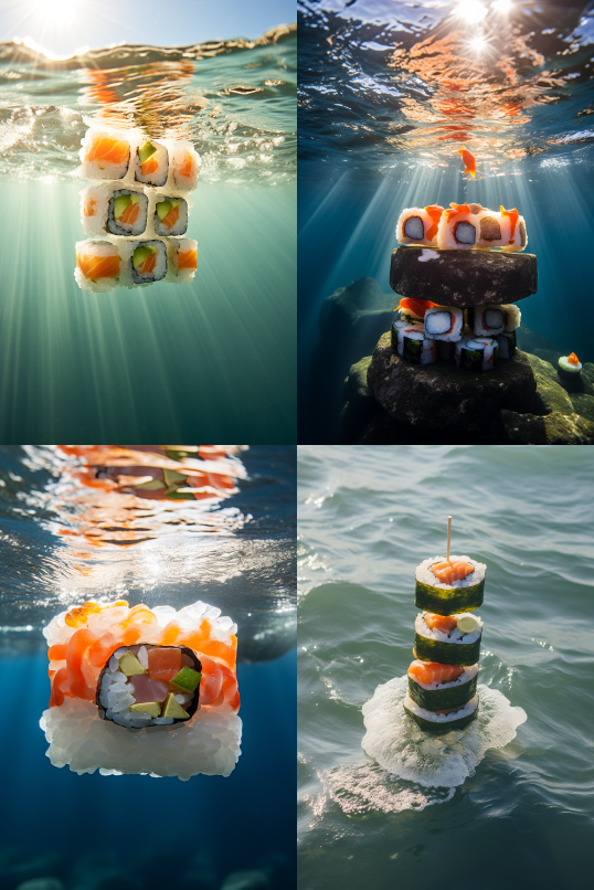 Midjourney Bot 更新时间:2023-08-31 09:06Sushi in the ocean --ar 2:3 --style raw --v 5.2