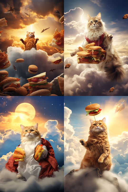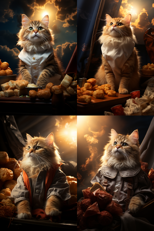 Midjourney Bot 更新时间:2023-08-31 09:23A cat eating KFC cloths, standing on the cloud sea, selling burgers, prime time lighting, adventure --ar 2:3 --style raw --v 5.2 --s 750