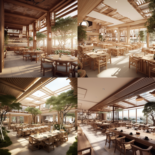 Midjourney Bot 更新时间:2023-08-31 09:12Catering space rendering, 450 square meters on the first floor, environmentally friendly, new Chinese style, wood color, with white as the auxiliary color, close to nature, and integrated with Chinese landscape. --ar 1:1 --style raw --v 5.2