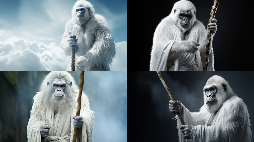 Midjourney Bot 更新时间:2023-08-31 09:21White ape spirit, very tall, majestic in appearance, holding an iron rod in hand --ar 16:9 --style raw --v 5.2