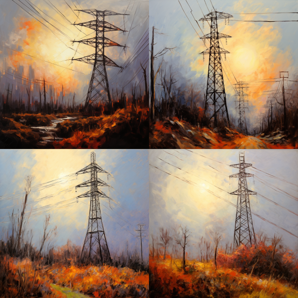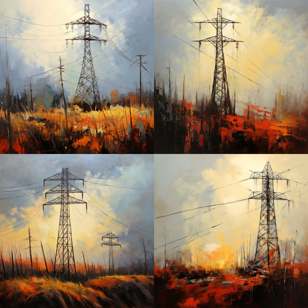 Midjourney Bot 更新时间:2023-08-31 08:55Oil painting, large scenes, ultra-high voltage towers, warm colors with low saturation --s 206 --ar 1:1 --style raw --v 5.2