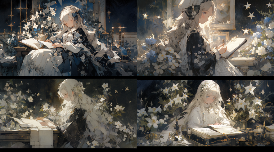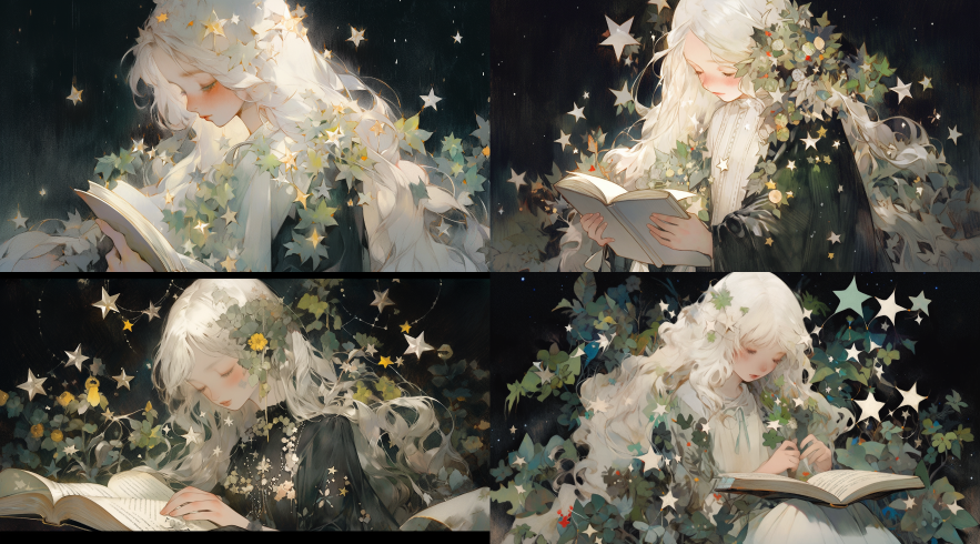 Midjourney Bot 更新时间:2023-08-31 02:35anime, girl, starry night, white, book, in the style of dark silver and light green, delicate flora depictions, exaggerated nobility, light yellow and dark gray, applecore, glassy translucence, eerily realistic ,Watercolour --ar 128:71 --niji 5 --s 750