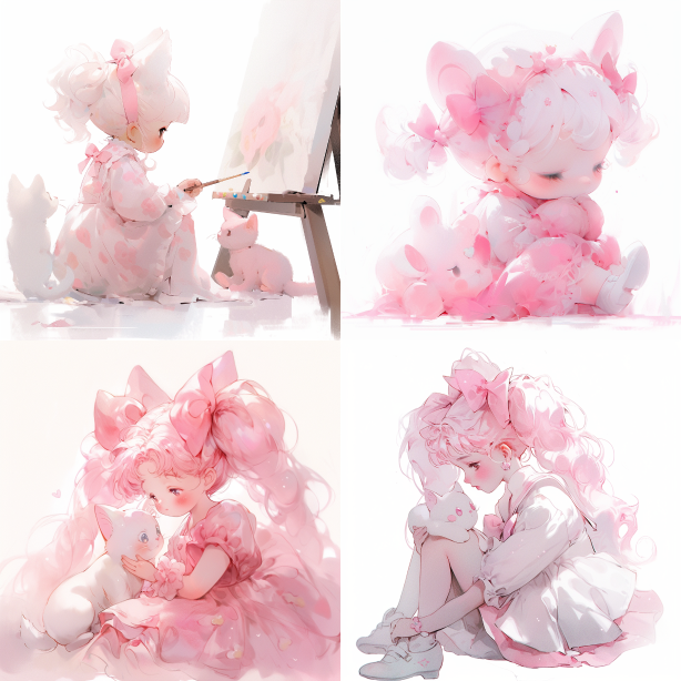 Midjourney Bot 更新时间:2023-08-31 00:58Cut any time girl, pink double ponytail, ears and tail, bell, pink doll dress, pink bow tie on head, cut face, sitting, front, white background, whole body, gouache, pink, oil painting texture, OC renderer, profile, soft pink tones, hyper realistic --ar 1:1 --niji 5