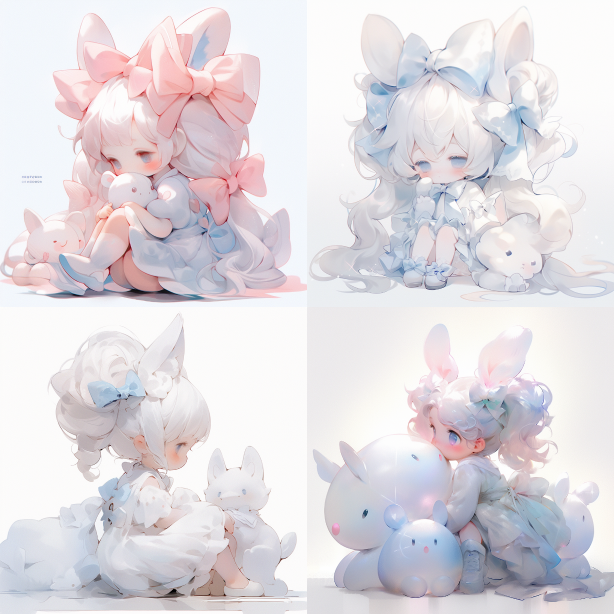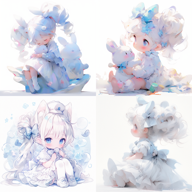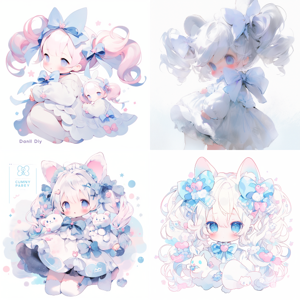 Midjourney Bot 更新时间:2023-08-31 01:45Cute anime girl, white double ponytail, ears and tail, bell, white doll dress, blue bow tied on head, cute face, sitting, front, white background, whole body, gouache, blue, oil painting texture, Wariza,OC renderer ,profile,soft pink tones,in the style of ambient occlusion, dolly kei, luminous palette, official art, white background, hyper-realistic --ar 1:1 --niji 5