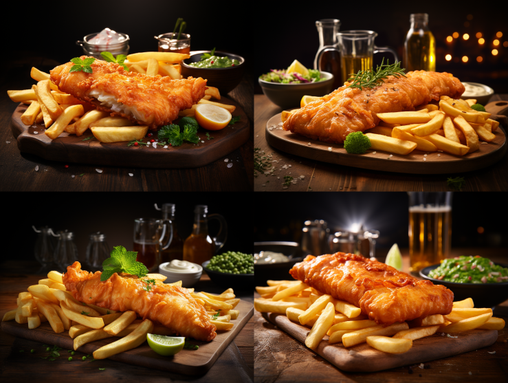 Midjourney Bot 更新时间:2023-08-31 02:35Perfect fish and chips, super quality, bright tone, product view, kitchen background, sharp focus, centered composition, natural lighting, photo real, photo realistic, award-winning photography, high contrast, 8K --upbeta --ar 4:3 --style raw --v 5.2 --s 250