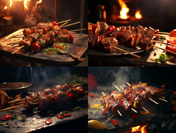 Midjourney Bot 更新时间:2023-08-31 00:56Lamb skewers, close-up, smoking, realistic filming, movie lighting, chili peppers, temptation, oil --ar 4:3 --style raw --v 5.2
