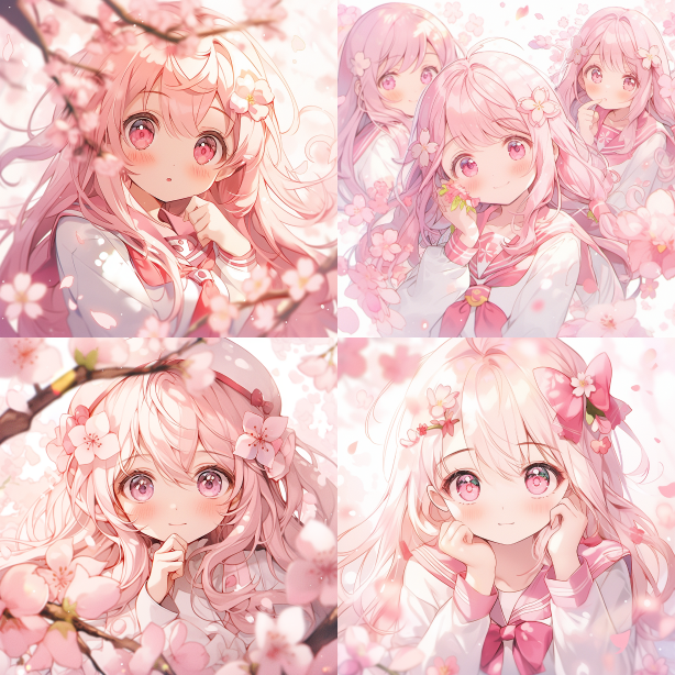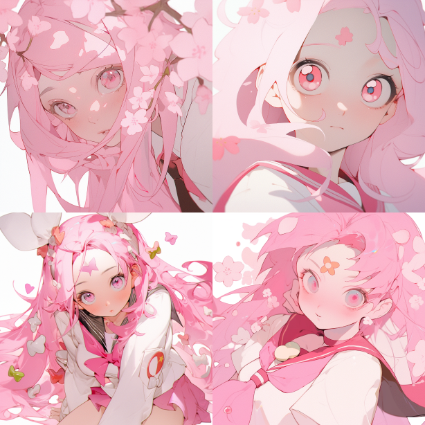 Midjourney Bot 更新时间:2023-08-31 01:18Soft pink, cherry blossom pink, light pink, white and pink sailor outfit, student uniform, pink long hair, Sakura Kinomoto, Cardcaptor Sakura, Sakura, cute clothes, pink, hazy, gorgeous, high definition, Q version, cute outfits, cute doll face, cherry blossoms, detailed close-up of the eyes, stars reflected in the eyes, eye details, pink and tender, youthful, normal proportions, normal fingers, delicate hands, proportional portrait, high-definition image quality, do not draw a wand. --s 99 --ar 1:1 --style expressive --niji 5