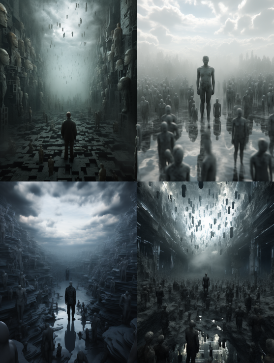 Midjourney Bot 更新时间:2023-08-31 01:37CG quality, 3D texture, in a chaotic and gloomy space, there are countless blurry figures standing. Above their heads, there is a sky that resembles a mirror. --ar 3:4 --v 5.2 --style raw