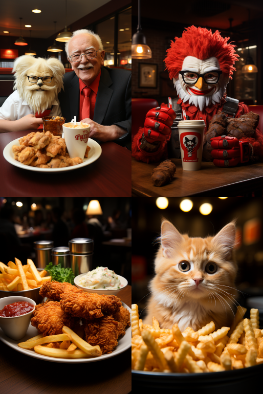 Midjourney Bot 更新时间:2023-08-31 01:24Crazy Thursday v Me 50, Cat, KFC --s 561 --ar 2:3 --style raw --v 5.2
