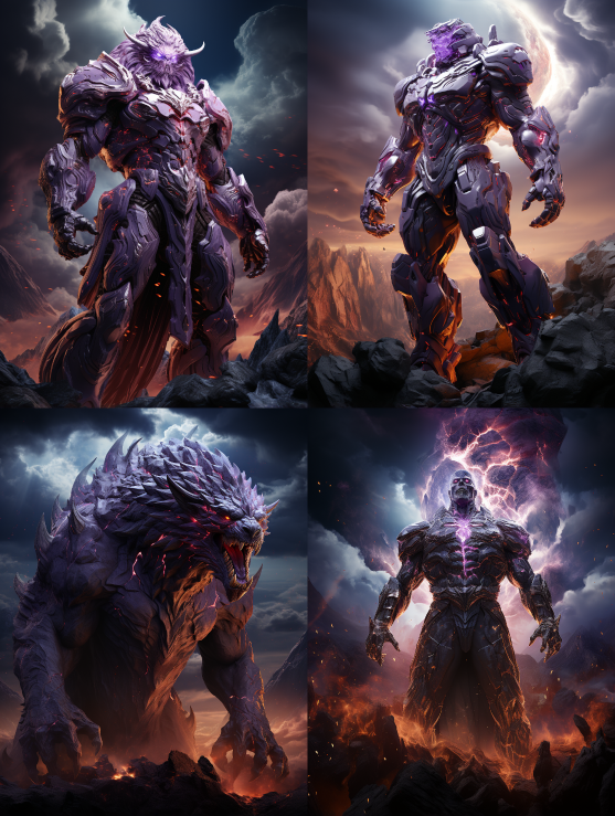 Midjourney Bot 更新时间:2023-08-30 23:11CG quality, 3D texture, a purple-armored general towering even higher than the mountains stands on a colorful and dazzling sky of clouds. He opens his arms, and lightning flashes in the sky. --ar 3:4 --v 5.2 --style raw --s 750