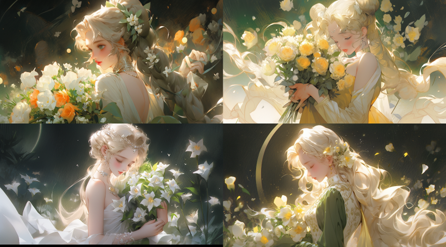 Midjourney Bot 更新时间:2023-08-30 22:35a white girl is standing with flowers in her hand, in the style of artgerm, the stars art group (xing xing), blink-and-you-miss-it detail, sailor moon, glistening, gentle color palette, dark yellow and green --ar 128:71 --niji 5