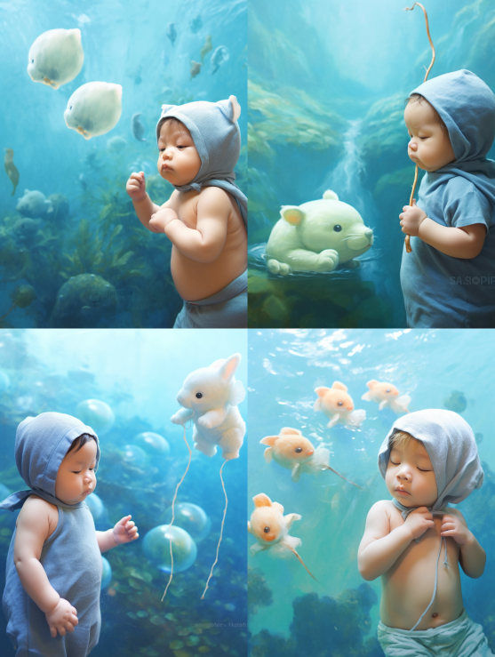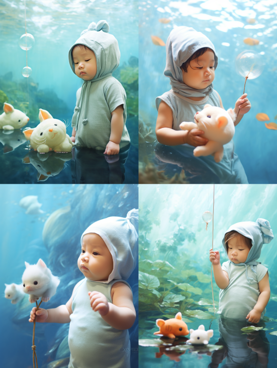 Midjourney Bot 更新时间:2023-08-30 22:37A cute baby boy stands in the water beside a fish, in the style of optical illusion paintings, soft, dreamy scenes, metropolis meets nature, dazecore, mist, realistic bird paintings, botw,Ghibli Studio --ar 3:4 --v 5.2 --style raw --s 250