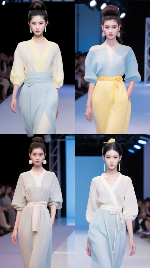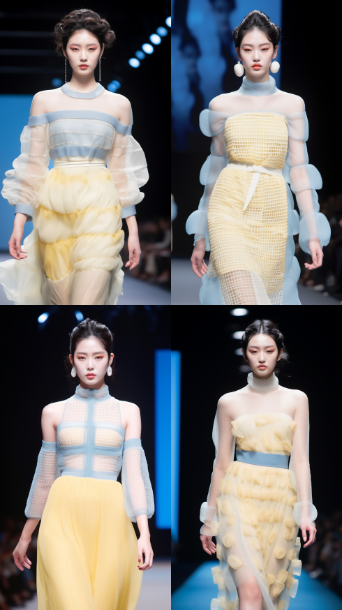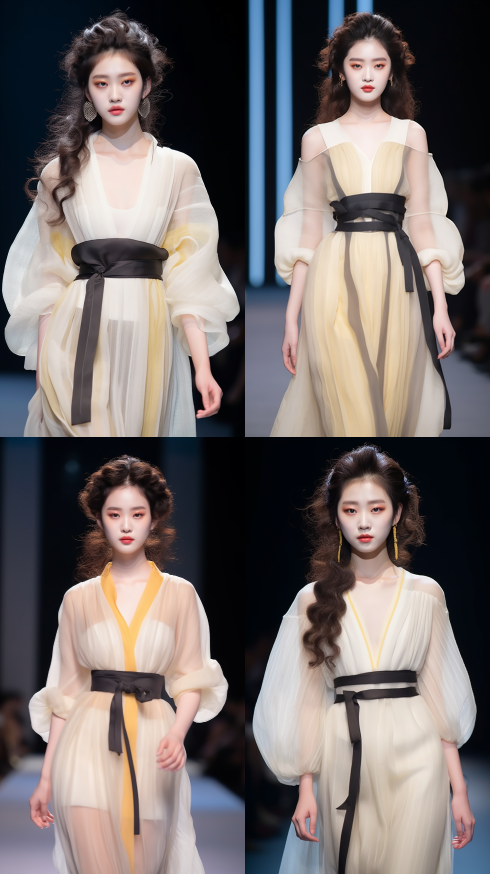 Midjourney Bot 更新时间:2023-08-30 22:55Chinese style, runway show, fashion week, Korean girl, exquisite face, wearing wool dress, woven, hollowed out, light yellow, with mesh stitching at the hem, plump lips, bright makeup, natural volume, delicate skin texture,full lipsheavy bright makeupnatural volumetric,delicate skin texture,Best quality,UHD,hair flower,hairpin,hair bun --ar 9:16 --style raw --v 5.2