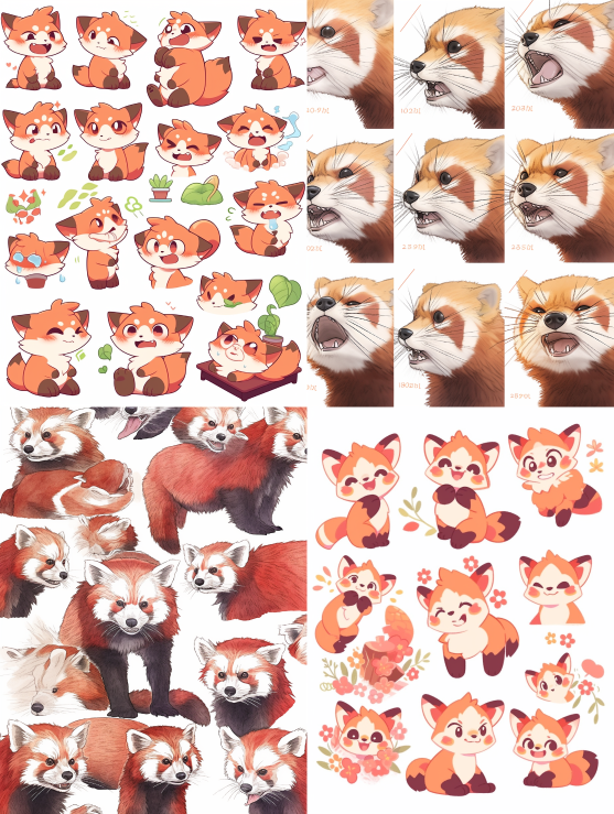 Midjourney Bot 更新时间:2023-08-30 22:45A cut red panda, face close-up, expression close-up, whole body piggy expressions and movements, exaggerated movements, happy, angle, sad, exaggerated, happy, etc., variable annotations, white background, q version, stick art design, UHD, 8k, nine square layout --s 72 --c 11 --ar 3:4 --style cute --niji 5