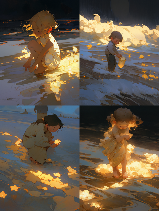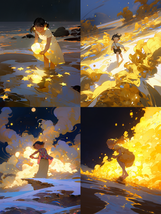 Midjourney Bot 更新时间:2023-08-30 22:54In the dark background, the dynamic magic light golden flowing clouds, golden shining sea, golden sun, golden giant fireworks on the sea, beautiful starry sky, colored fireworks, a super cut little girl is bent over to pick up shells, full body, chunky acrylic paint, soft lighting, bright, Morning Light, Dreamy Shadows, 3D Stereos Topic style, Illustrations, Fantasy Style, Pastel colors, Medical, Realistic, Hyperdetail, C4D, Octane rendering, 8K, HD --ar 3:4 --style expressive --niji 5 --s 750