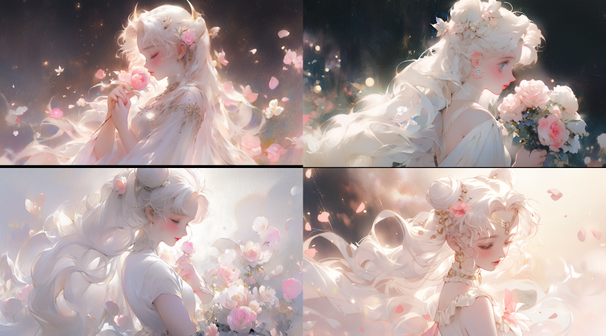 Midjourney Bot 更新时间:2023-08-30 22:39a white girl is standing with flowers in her hand, in the style of artgerm, the stars art group (xing xing), blink-and-you-miss-it detail, sailor moon, glistening, gentle color palette, dark white and pink --ar 128:71 --niji 5