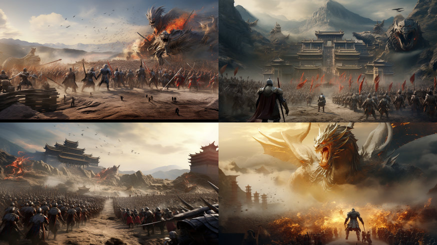Midjourney Bot 更新时间:2023-08-30 22:49Chinese Dragon Knights vs. Monsters, Chinese Long Sword, Chinese Armor, Horizontal Screen, Charge.,Chinese dragon,UHD,16K,unreal engine 5,HDR,high resolution,photorealistic,documentary photography,cinematic style,The Great Wall of China,Ancient Chinese sword,Panorama painting --ar 16:9 --style raw --v 5.2