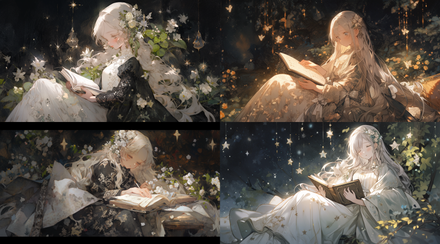 Midjourney Bot 更新时间:2023-08-30 23:11anime, girl, starry night, white, book, in the style of dark silver and light green, delicate flora depictions, exaggerated nobility, light yellow and dark gray, applecore, glassy translucence, eerily realistic --ar 128:71 --niji 5