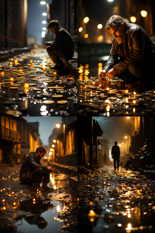 Midjourney Bot 更新时间:2023-08-30 21:54On a quiet night, a lonely and destitute person walked aimlessly on a desolate street. Looking around, he saw countless pennies scattered on the ground, shimmering with a faint light. These small and ordinary coins seemed to be symbols of forgotten wealth, but they held no special meaning for him. He looked up and was amazed to see a bright moon hanging in the sky. The moon was so round and brilliant, like a giant gem suspended in the dark backdrop. Its light spilled onto the earth, illuminating those forgotten pennies, making them come alive and powerful. The moon was the most dazzling focal point of the entire scene, radiating a mysterious and magical glow, injecting an atmosphere of mystery and hope into the entire setting. --ar 2:3 --style raw --v 5.2 --s 750