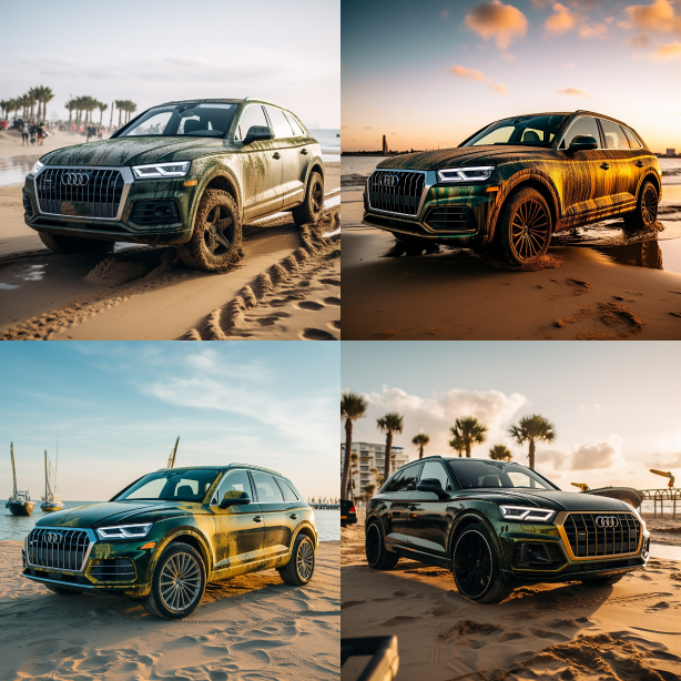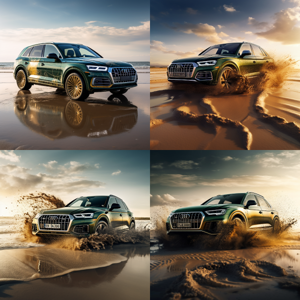 Midjourney Bot 更新时间:2023-08-30 21:43Masterpiece, high quality, 8k, hardworking Audi Q5L, dark green + gold trim car wrap, at the beach competition, splashing up dust and water splashes, natural lighting. --ar 1:1 --style raw --v 5.2