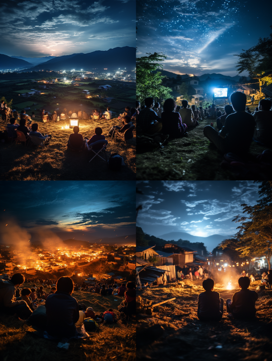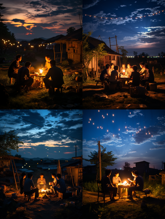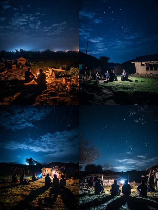 Midjourney Bot 更新时间:2023-08-30 21:59At night in rural China, the sky is very dark and the stars are shining. A few people sit around chatting --ar 3:4 --style raw --v 5.2