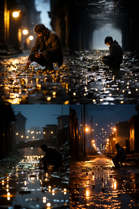 Midjourney Bot 更新时间:2023-08-30 21:58On a quiet night, a lonely and destitute person walked aimlessly on a desolate street. Looking around, he saw countless pennies scattered on the ground, shimmering with a faint light. These small and ordinary coins seemed to be symbols of forgotten wealth, but they held no special meaning for him. However, just as he was about to give up, he looked up and marveled at the sight of a bright moon hanging in the sky. The moon was so round and brilliant, like a giant gem suspended in the dark backdrop. Its light spilled onto the earth, illuminating those forgotten pennies, making them come alive and powerful. This strange sight intoxicated him, and his eyes were filled with anticipation and determination, as if he was about to take a step towards a new journey. The moon was the most dazzling focal point in the entire scene, radiating a mysterious and magical light, injecting an atmosphere of mystery and hope into the entire setting. It was an image of adventure and infinite possibilities, stirring the viewers' inner desire for exploration and adventure, causing them to forget about the mundane daily life and pursue the unknown realms of their dreams. --ar 2:3 --style raw --v 5.2 --s 750