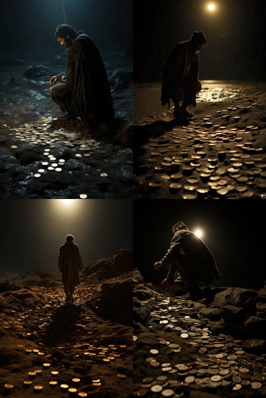 Midjourney Bot 更新时间:2023-08-30 22:03On a quiet night, a lonely and impoverished person walked aimlessly on a wasteland. There were no lights around, and looking around, he saw countless sixpences scattered on the ground, shimmering faintly. These small and ordinary coins seemed to be symbols of forgotten wealth, but he did not reach out to pick them up. He stood and looked up, amazed to find a bright moon hanging in the sky. The moon was so perfect and brilliant, as if a huge gem was hanging in the dark setting. Its light fell on the earth, illuminating the forgotten sixpences, making them vivid and powerful. The moon is the most dazzling focus in the entire scene, emitting a mysterious and magical light, injecting a mysterious and hopeful atmosphere into the entire scene. --ar 2:3 --style raw --v 5.2
