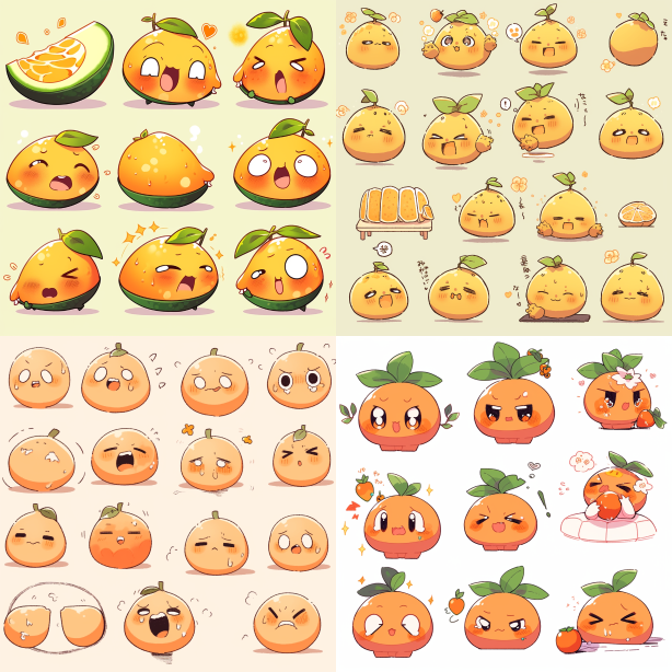 Midjourney Bot 更新时间:2023-08-30 21:51A set of emoticons, a papaya with eyes and mouth, simulating human expressions --c 1 --ar 1:1 --niji 5