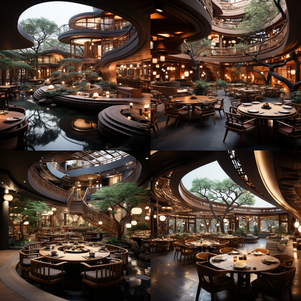 Midjourney Bot 更新时间:2023-08-30 21:57A Chinese style steamed chicken restaurant with a wooden color scheme, curved ceiling, and a courtyard view in the middle, with high definition, 8k --ar 1:1 --style raw --v 5.2 --s 750