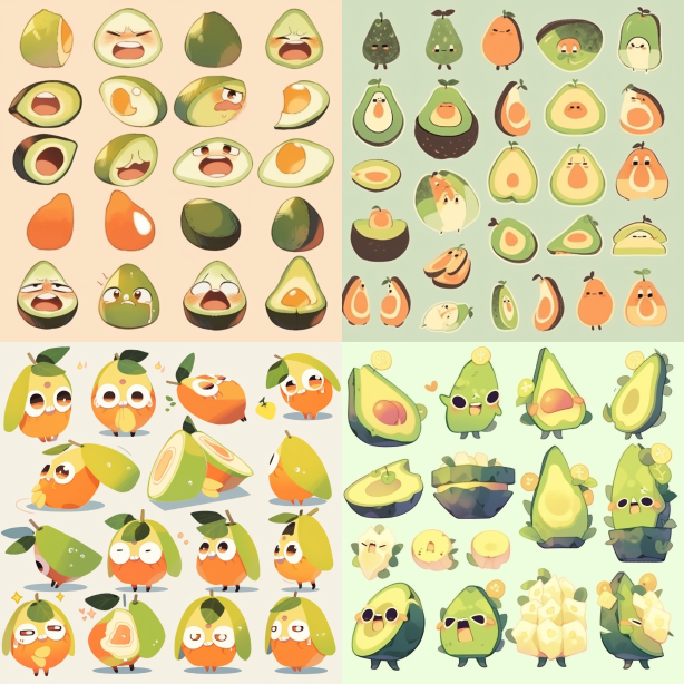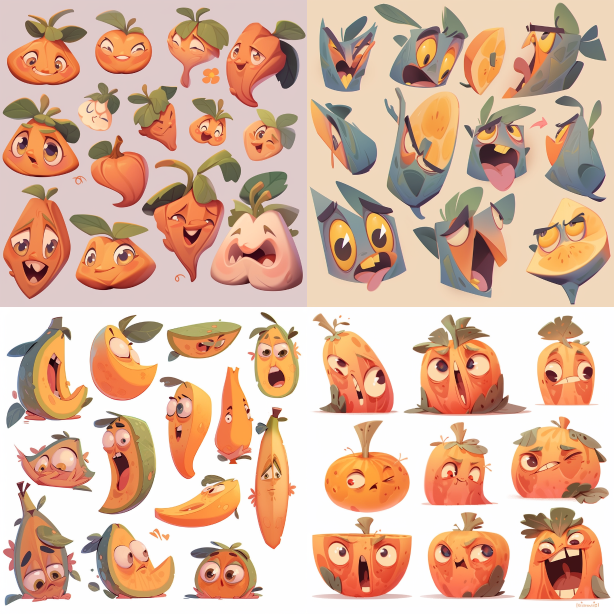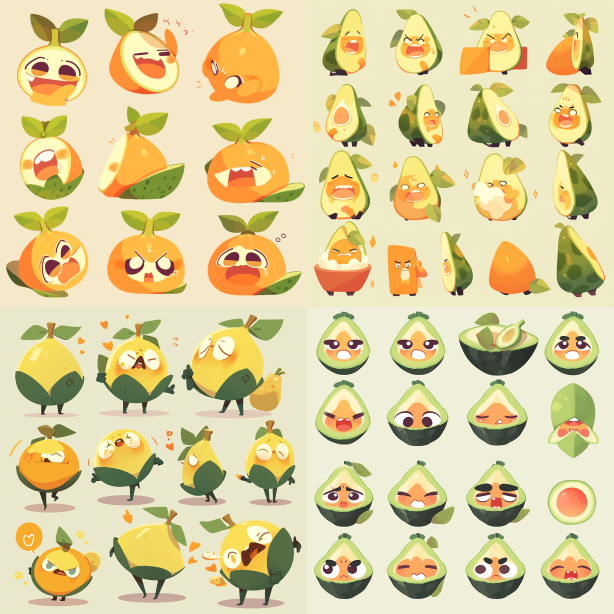 Midjourney Bot 更新时间:2023-08-30 21:16Cartoon style emoji pack, a papaya with eyes and mouth, simulating human expressions --c 1 --ar 1:1 --style cute --niji 5