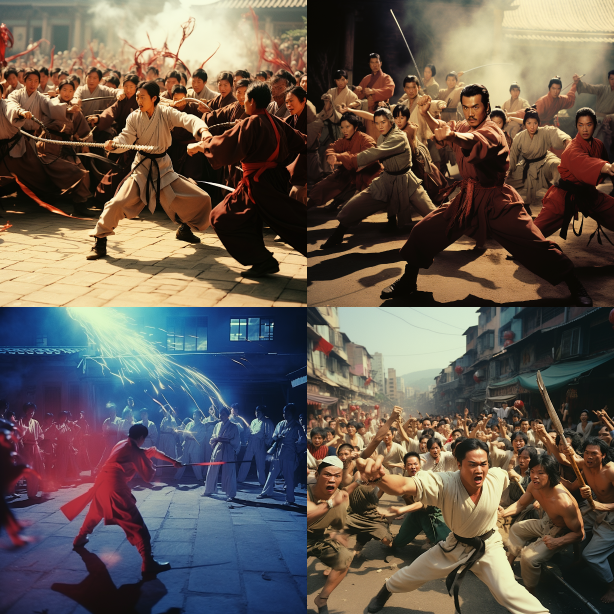 Midjourney Bot 更新时间:2023-08-30 21:11Chinese martial arts battle against aliens, Qigong, Wave Fist, Blade and Sword Shadow, Hong Kong's 1980s martial arts film style, Shaw's film style, onlookers cheering and cheering, Chinese style background.,Retro-futurism,documentary photography,cinematic style,UHD,Ancient Chinese sword,Wuxia,Kung Fu,Chinese dragon,Wing Tsun,Chinese Martial Arts,Forbidden City,chinese Gardens --ar 1:1 --style raw --v 5.2