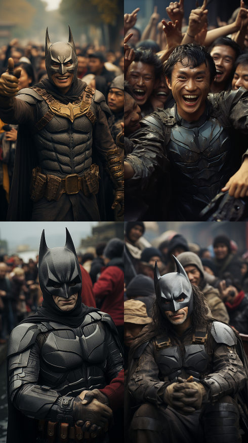 Midjourney Bot 更新时间:2023-08-30 21:00In the 1980s, on the streets of China, Batman had friendly exchanges with the Chinese people, exchanging wrists, taking photos, and the crowd gathered to watch with a smile on their faces.,UHD,16K,unreal engine 5,photorealistic,hyper realistic,documentary photography,Dragon Boat,Kylin,Yin,Yang,Zen Buddhism,A Dream in Red Mansions --ar 9:16 --style raw --v 5.2 --s 750