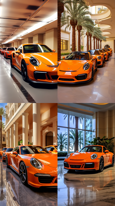 Midjourney Bot 更新时间:2023-08-30 21:05Masterpiece, high quality, 16K, 22 Porsche Parametras in the color of Papaya Orange, parked in a high end hotel --ar 9:16 --style raw --v 5.2