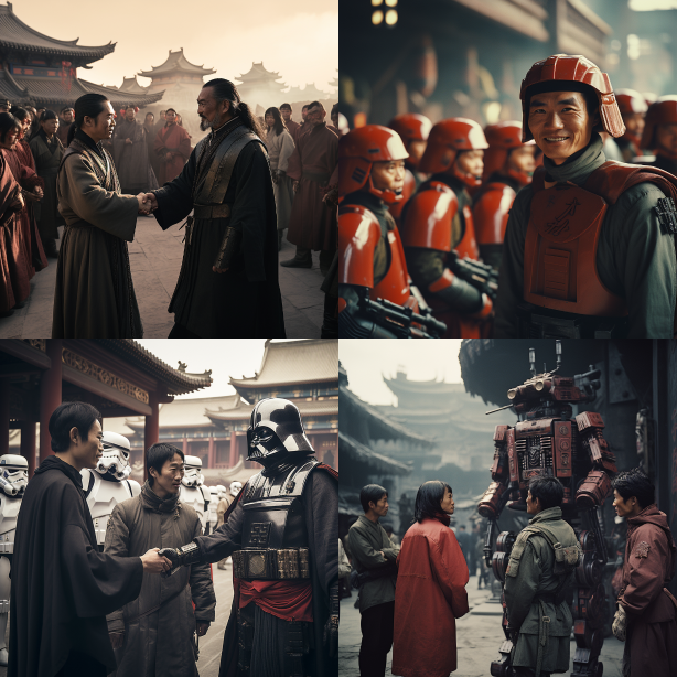Midjourney Bot 更新时间:2023-08-30 21:03In the scenery of China in the 1980s, Storm Soldiers and Jedi Knights shook hands with Chinese people and had friendly conversations. People gathered around and curiously examined their weapons.,UHD,16K,unreal engine 5,documentary photography,cinematic style,Retro-futurism,Forbidden City,Wuxia --ar 1:1 --style raw --v 5.2