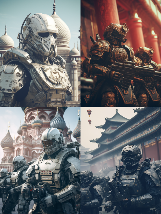 Midjourney Bot 更新时间:2023-08-30 21:18Qing Dynasty soldiers, robots, high-tech weapons, intense fighting, alien invasion.,photorealistic,UHD,16K,cinematic style,The Taj Mahal,Retro-futurism --ar 3:4 --style raw --v 5.2