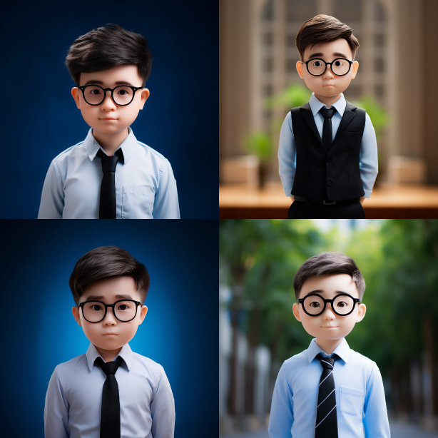 Midjourney Bot 更新时间:2023-08-30 14:47Photography works from Disney Pixar Studios, featuring a boy in a dark suit, with a Disney-style appearance. He has a round face and is an adorable chubby boy. The background is white, and he has big eyes, wears glasses, and has no wrinkles. The photography has a Pixar-level ultra-detailed feel, with a clay-like texture, reflective and transparent rainbow colors, soft tones, simulated effects, delicate gloss, clean background, 3D rendering, soft focus, and the use of technologies like Octane and Blender for the best image quality. --ar 1:1 --v 5.2 --style raw --s 250