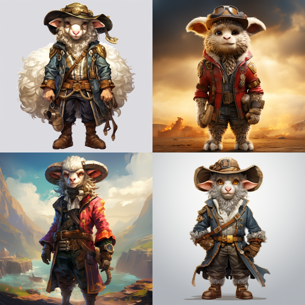 Midjourney Bot 更新时间:2023-08-30 14:47Pirate, full body, sheep, cool, mighty, colorful. --ar 1:1 --style raw --v 5.2 --s 250