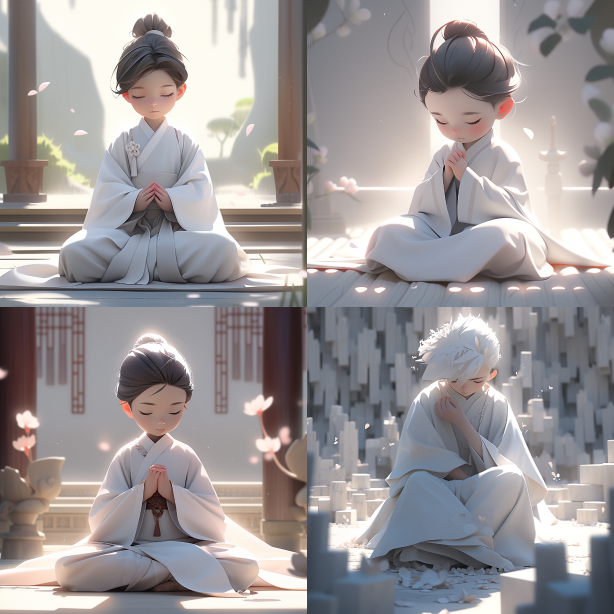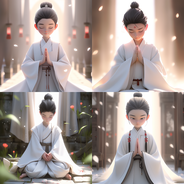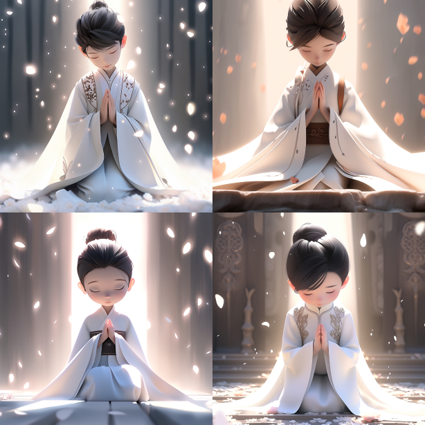 Midjourney Bot 更新时间:2023-08-30 12:38Chinese style, cute boy praying, wearing white clothes to pose in a sacred position on the ground, light white and light silver styles, childlike innocence, classical inspiration, detailed design, 3D, c4d, Hyperdetailed, animated lighting, bokeh, perfectdetails, FHD, 4K, 8K - ar 1:1-- niji --s 110 --c 3 --iw 2 --ar 1:1 --niji 5