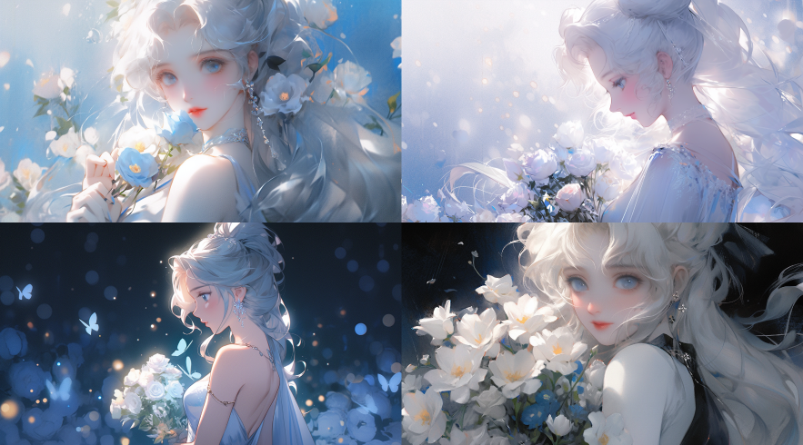 Midjourney Bot 更新时间:2023-08-30 12:46a white girl is standing with flowers in her hand, in the style of artgerm, the stars art group (xing xing), blink-and-you-miss-it detail, sailor moon, glistening, gentle color palette, dark white and blue --ar 128:71 --niji 5