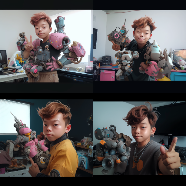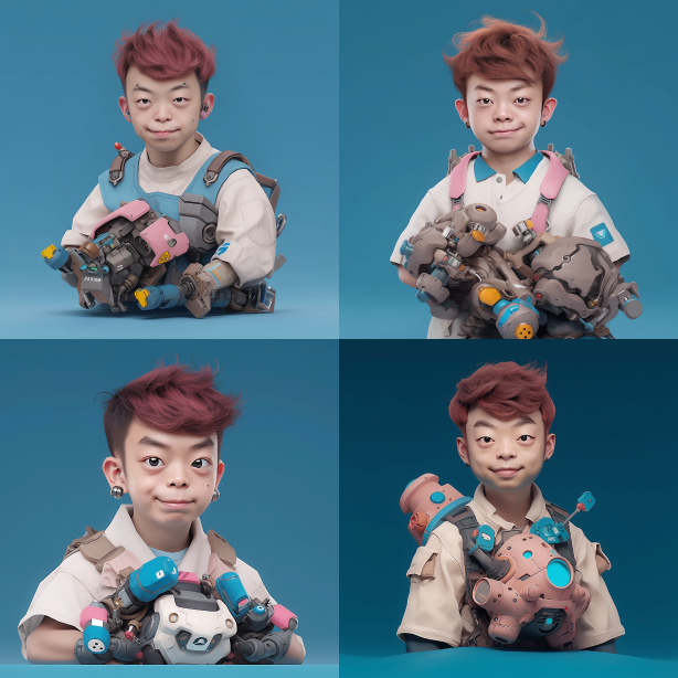 Midjourney Bot 更新时间:2023-08-30 12:323D toys, Cyberpunk style, A little boy dressed in mechanical arm preparation: 2 In the image: 1, 3- years - old, His hands have two rocket launchers, His arm structure is very granular complex, The arm is very large and objective, light pin hair, light pin eyes, blue pupils, His arm is gray, blue, pink, yellow, and white, He is wearing a Helmet on his head, There is glass on the helmet, there are electrical requirements and letters on the arm, cut, best quality, mockup blind box, pop mart design, full body, vivo colors, street style, lots of details, metallic texture, clean background, light gray background, white environment, 8k HD, Dark background, art, 3D, C4D, blend, OC rederer, high detail --s 180 --ar 1:1 --style expressive --niji 5