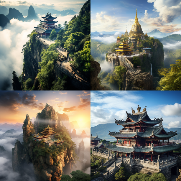 Midjourney Bot 更新时间:2023-08-30 12:44On the majestic mountain peak, there stands a temple, exuding a powerful and awe-inspiring beauty. --ar 1:1 --style raw --v 5.2