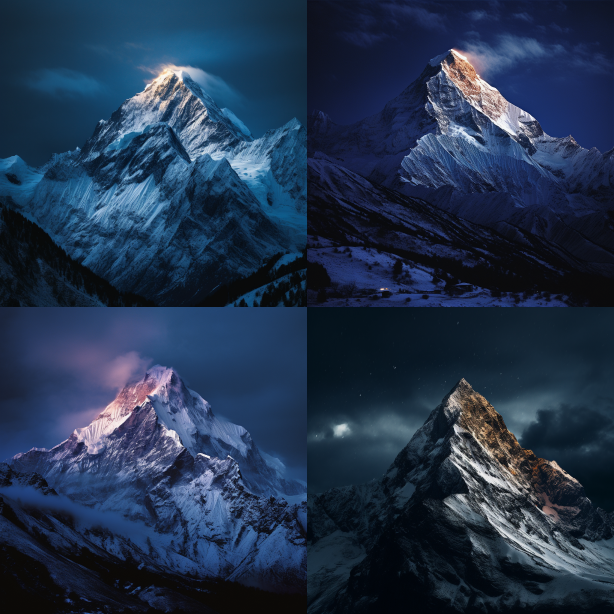Midjourney Bot 更新时间:2023-08-30 12:32a mountain with snow on the top of it, in the style of luminescent installations, documentary travel photography, dark, foreboding colors, konica auto s3, national geographic photo, busy landscapes, light indigo and bronze --ar 1:1 --style raw --v 5.2