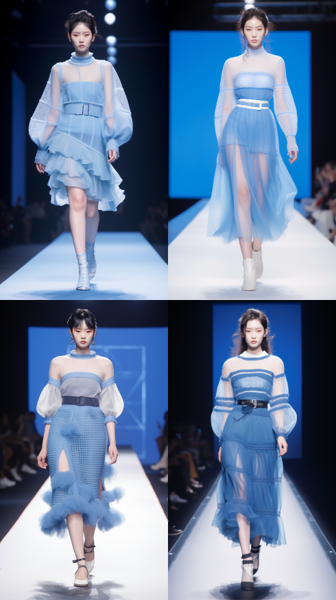 Midjourney Bot 更新时间:2023-08-30 12:44Korean style, runway show, model with head turned, smiling face, background screen, wearing a blue knitted dress, hollowed out, mesh stitching, petal sleeves, high waist, belt strap, --s 26 --c 3 --ar 9:16 --style raw --v 5.2