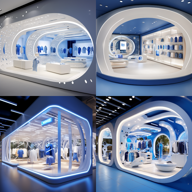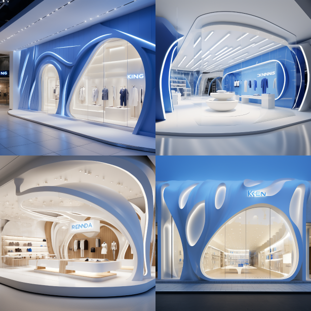 Midjourney Bot 更新时间:2023-08-30 12:39Long lens, concept kids clothing store front design, soft light for clothing industry, metal plate and line light, simple display, blue outside and white inside, located in shopping mall, sports theme atmosphere, 4K, super detail, realistic,Kengo Kuma,Zaha Hadid --ar 1:1 --style raw --v 5.2