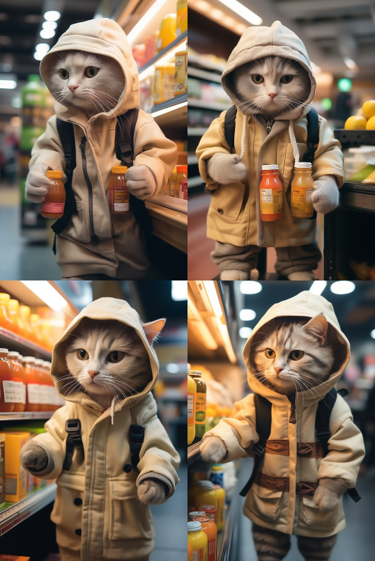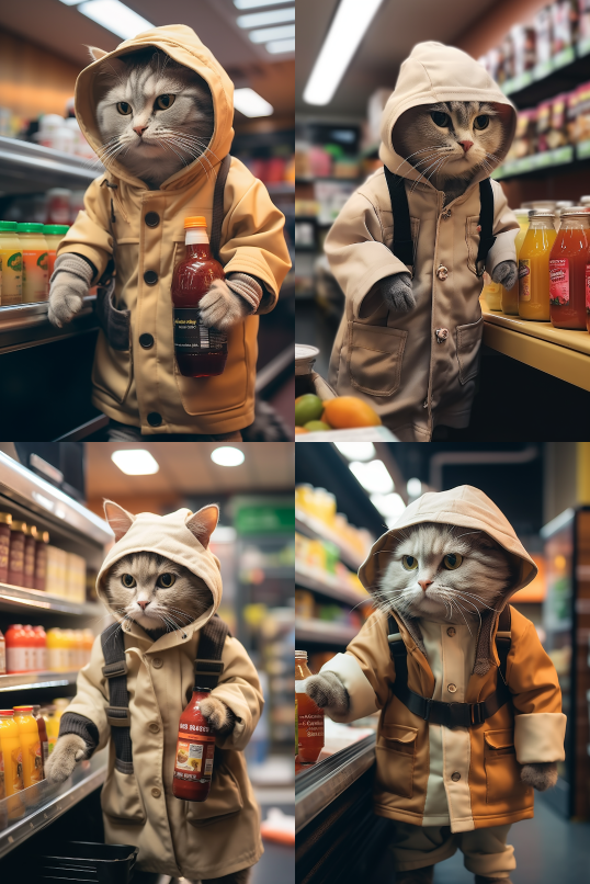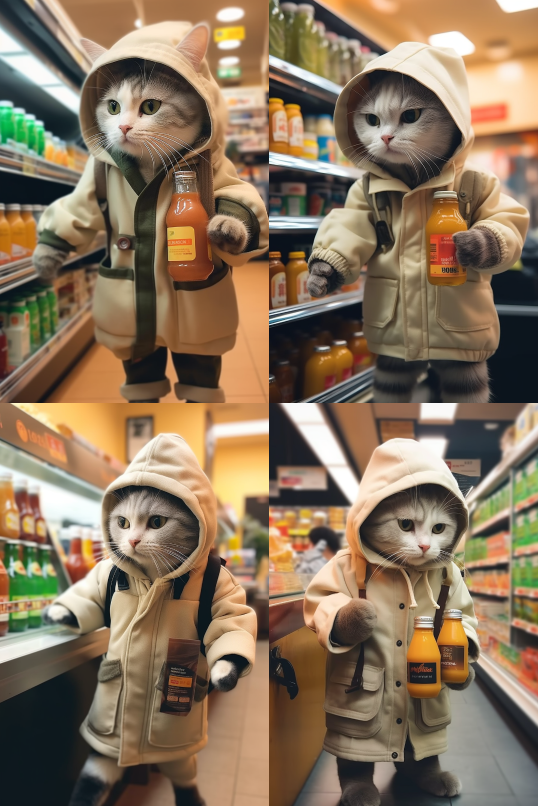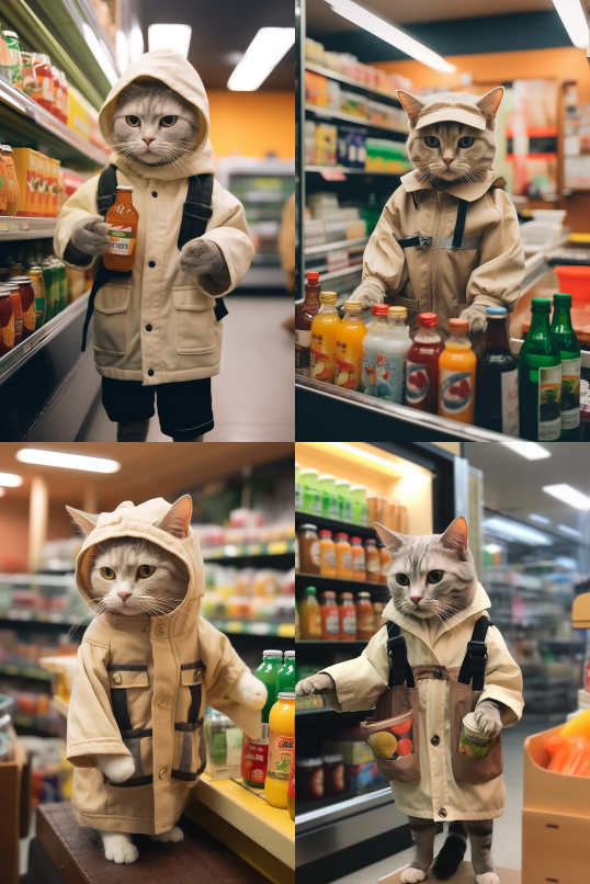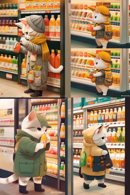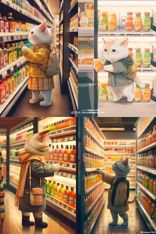 Midjourney Bot 更新时间:2023-08-30 12:13A cat wearing clothes is buying drinks at a convenience store to warm and heal the wind --iw 2 --ar 2:3 --style raw --v 5.2
