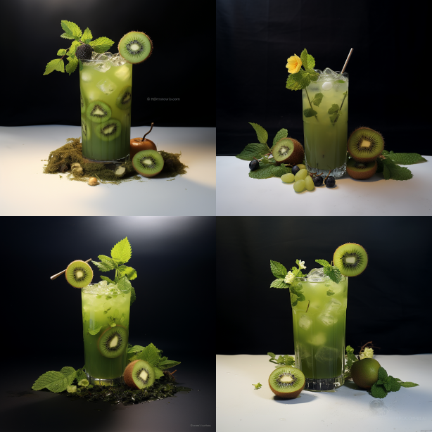 Midjourney Bot 更新时间:2023-08-30 12:17On the black gray table, there is a cup of kiwifruit flavored Mojito, filled with flowers and fruits from the forest landscape. The simple black gray background is characterized by a surreal fantasy style, charming character illustrations, vray rendering, rich and immersive nature, and excellent atmosphere. --ar 1:1 --style raw --v 5.2
