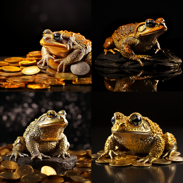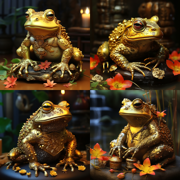 Midjourney Bot 更新时间:2023-08-30 12:07The body of a toad is tattooed with gold coins --ar 1:1 --v 5.2 --style raw --s 750