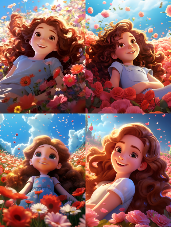 Midjourney Bot 更新时间:2023-08-30 11:57A lovely little girl lying in a field of rose, buses, surrounded by colorful flowers, sunlight, big sparking eyes, long curly hair, a blue sky in the background, a warm summer day, animated movie produced by Pixarstudios, bright color, integrated illustrations, --ar 3:4 --style raw --v 5.2