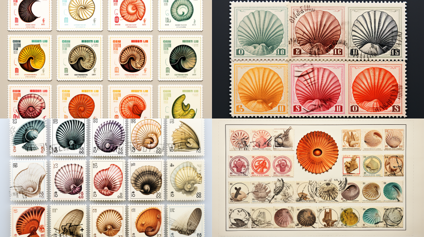 Midjourney Bot 更新时间:2023-08-30 11:33Shell stamp, stamp collection, modern exhibition hall, white --ar 16:9 --style raw --v 5.2 --s 250