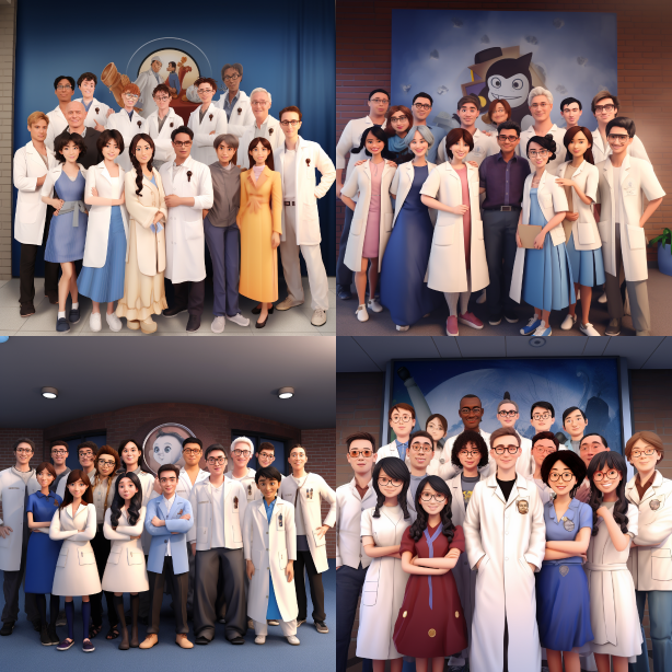 Midjourney Bot 更新时间:2023-08-30 11:45There are a total of 12 members in the photo (only 12, please do not add more). Please draw Disney cartoon characters wearing white lab coats based on the characters' features in the photo (such as hairstyle, wearing glasses, skin color, etc.). Each character should have their own unique features according to the photo. The mentor in the middle, who only has a little white hair, should be highlighted. --ar 1:1 --v 5.2 --style raw